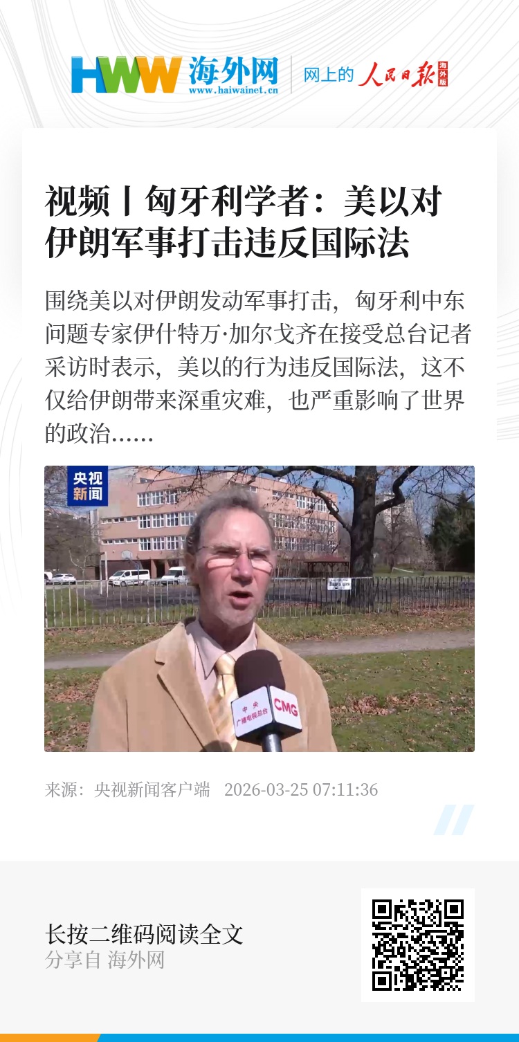 围绕美以对伊朗发动军事打击,匈牙利中东问题专家伊什特万·加尔戈齐在接受总台记者采访时表示,美以的行为违反国际法,这不仅给伊朗带来深重灾难,也严重影响了世界的政治和经济发展。