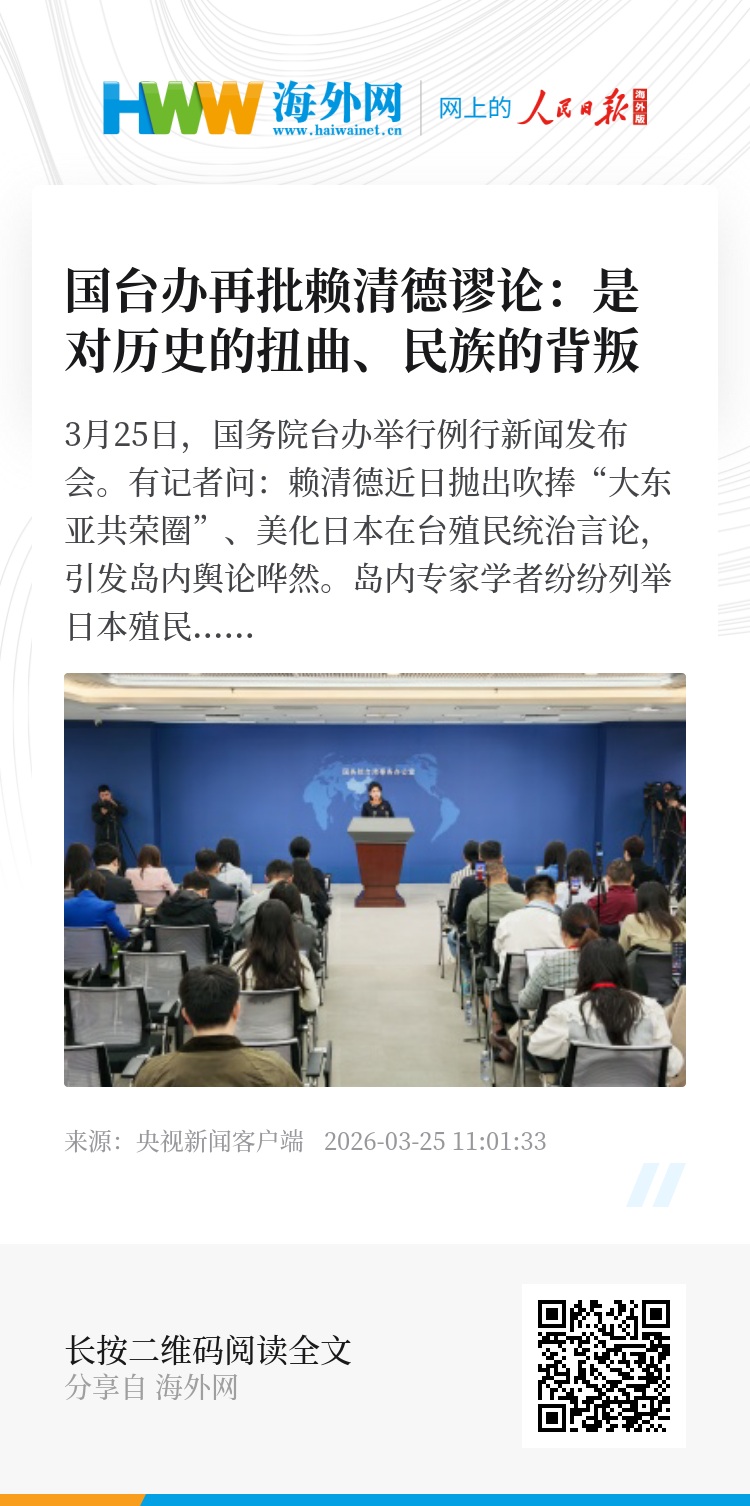 3月25日,国务院台办举行例行新闻发布会。有记者问:赖清德近日抛出吹捧“大东亚共荣圈”、美化日本在台殖民统治言论,引发岛内舆论哗然。岛内专家学者纷纷列举日本殖民者在台犯下的屠杀、扫荡等罪行,批评赖清德当局为政党和个人私利,扭曲历史,媚日恋殖,制造仇恨与对立。对此有何评论?