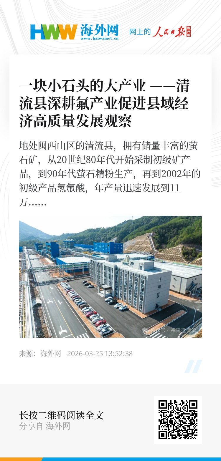 “十五五”展望在即,清流县以全产业链产值突破100亿元为目标,打造无机氟化物、含氟聚合物、含氟精细化学品、氟碳化学品四大板块协同发展,产业链从基础原料向中高端材料、终端应用延伸的县域经济。(记者:吴火招)