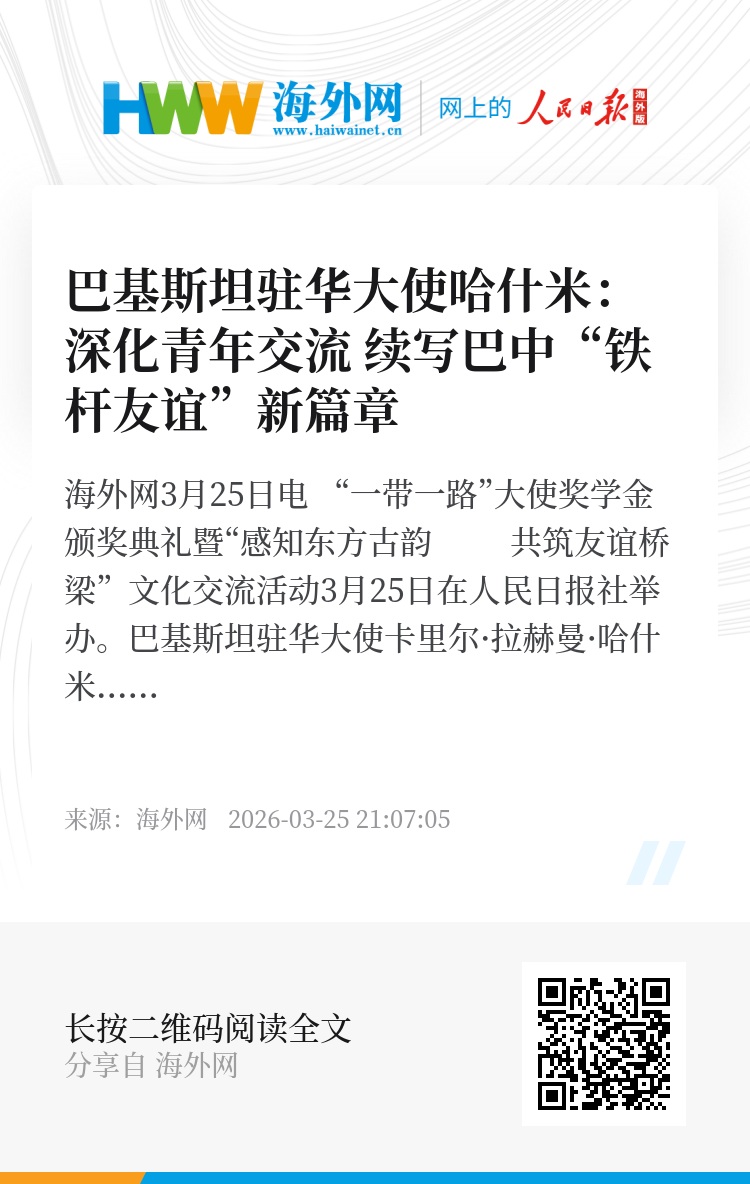 海外网3月25日电 “一带一路”大使奖学金颁奖典礼暨“感知东方古韵 共筑友谊桥梁”文化交流活动3月25日在人民日报社举办。巴基斯坦驻华大使卡里尔·拉赫曼·哈什米出席活动并致辞,他鼓励在华巴基斯坦学子把握机遇、追求卓越,努力成为连接巴中两国的桥梁,续写巴中“铁杆友谊”,助力“一带一路”建设走深走实。