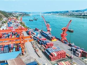 广西壮族自治区梧州港锚定产业与区域物流需求,优化港口功能布局,为中国—东盟自贸区提供高效综合物流支撑。图为近日梧州港李家庄作业区内,集装箱吞吐作业一派繁忙。何华文摄 (人民视觉)
