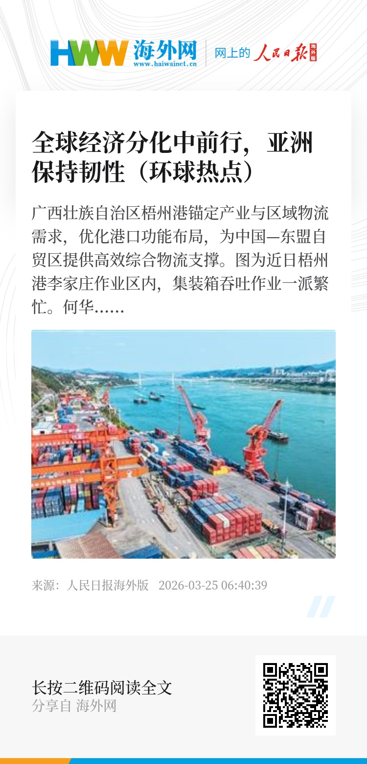 数据显示,2010—2024年,亚洲地区大部分发展中经济体保持4%乃至5%以上的增长;亚洲占全球制造业增加值超过50%,在机电、新能源汽车等领域初步形成产业链供应链协同发展网络;2025年亚太地区接待国际游客3.31亿人次,同比增长6%……近年来,亚洲多国稳增长政策显现成效,区域经济一体化的红利不断释放,亚洲经济正呈现出多个增长极协同发力的向好态势。