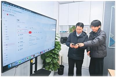 近日,在中国(南京)软件谷“质能·工坊”OPC社区,技术人员安装完开源AI智能体“龙虾”后与用户(左)交流。