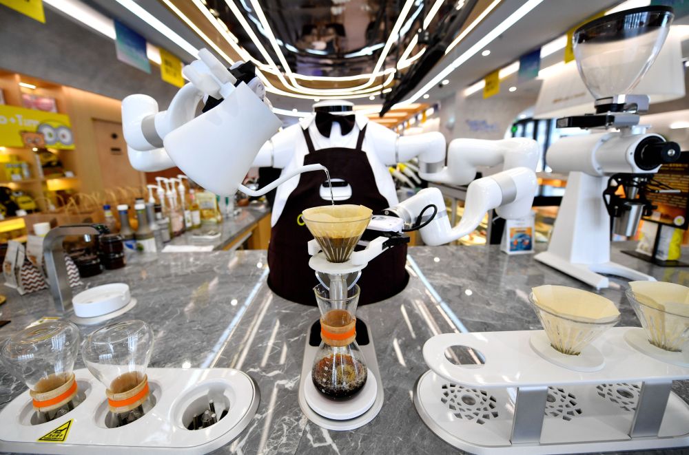 2024年1月17日,在雄安新区一家咖啡店内,AI机器人在制作咖啡。