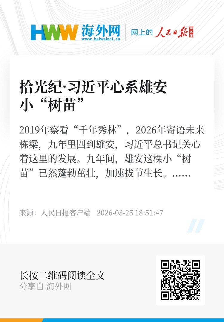 2019年察看“千年秀林”,2026年寄语未来栋梁,九年里四到雄安,习近平总书记关心着这里的发展。九年间,雄安这棵小“树苗”已然蓬勃茁壮,加速拔节生长。