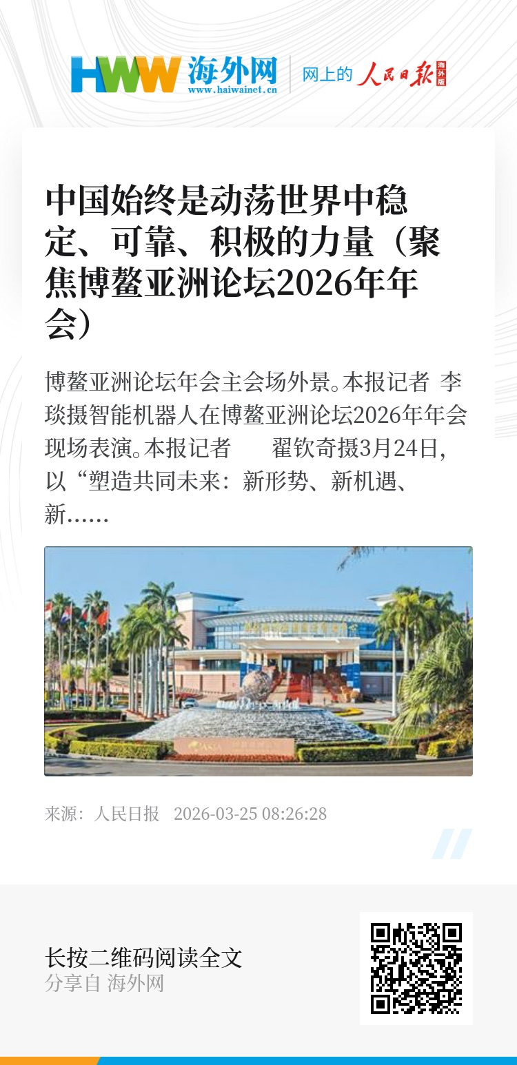 博鳌亚洲论坛2026年年会上关于“十五五”蓝图的热烈探讨,向世界传递清晰的信号:在不确定的世界中,中国的确定性是最值得珍视的资源。与中国同行,就是与机遇同行。