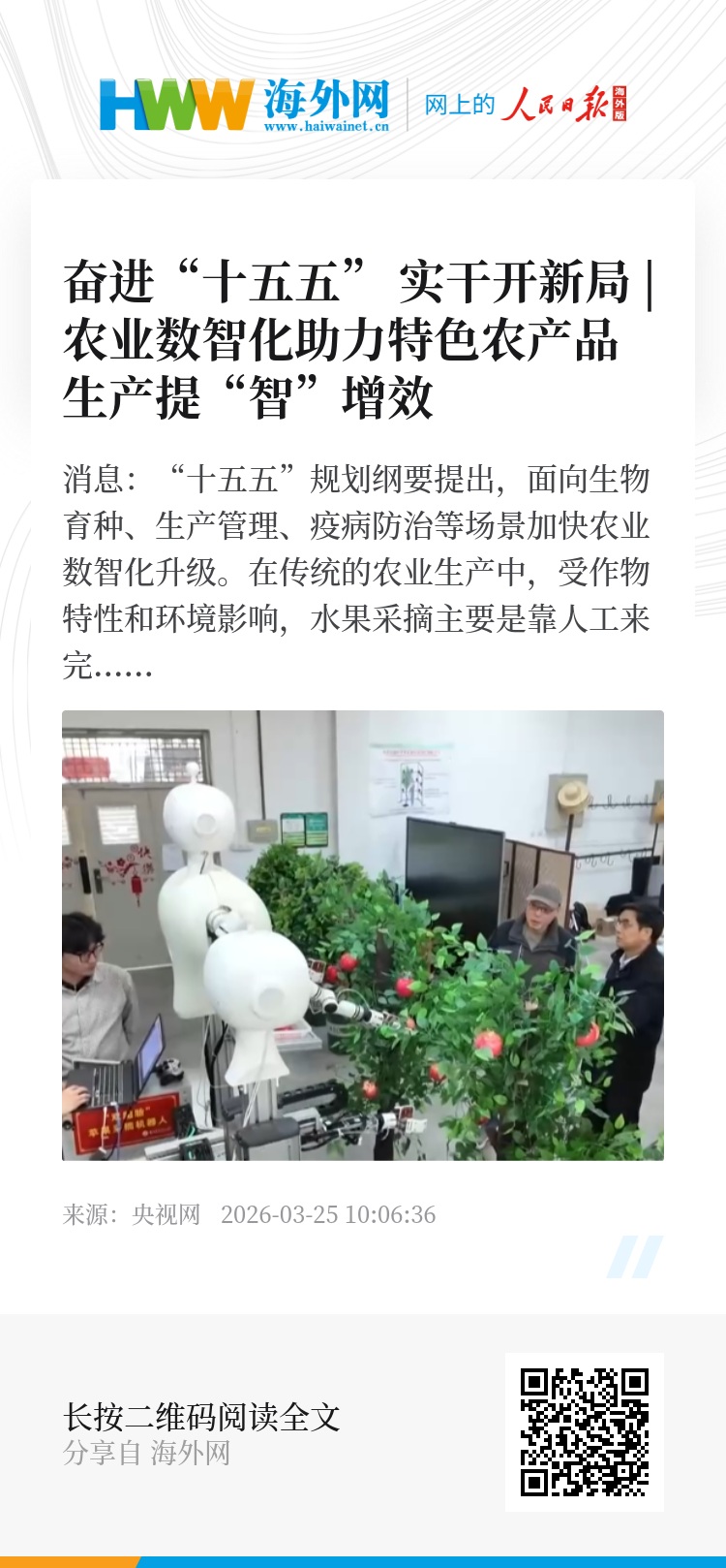 央视网消息:“十五五”规划纲要提出,面向生物育种、生产管理、疫病防治等场景加快农业数智化升级。在传统的农业生产中,受作物特性和环境影响,水果采摘主要是靠人工来完成的。最近,科研人员研制出一款苹果采摘机器人并投入实际验证。机器人怎么摘苹果,如何提高生产效率?