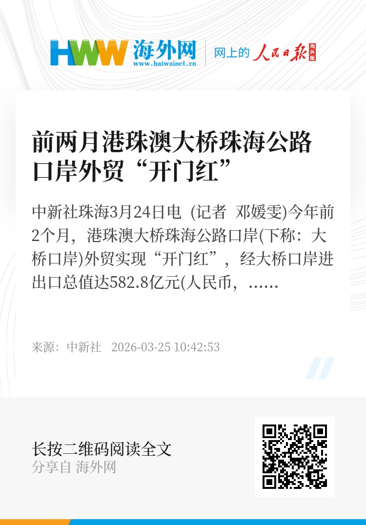 中新社珠海3月24日电 (记者 邓媛雯)今年前2个月,港珠澳大桥珠海公路口岸(下称:大桥口岸)外贸实现“开门红”,经大桥口岸进出口总值达582.8亿元(人民币,下同),同比增长55.8%。