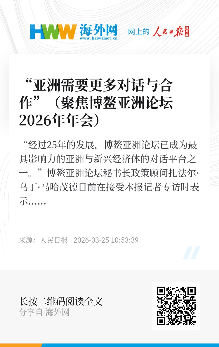 “经过25年的发展,博鳌亚洲论坛已成为最具影响力的亚洲与新兴经济体的对话平台之一。”博鳌亚洲论坛秘书长政策顾问扎法尔·乌丁·马哈茂德日前在接受本报记者专访时表示,博鳌亚洲论坛2026年年会的举办凸显和平对话、广泛合作的重要意义。东道主中国的稳定发展,为亚洲及世界发展繁荣增添积极力量。