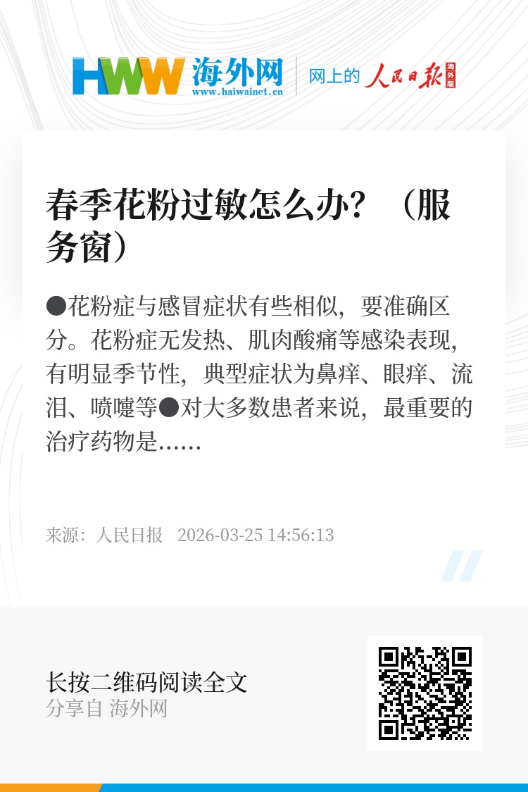 出现特定症状要及时就医。王子熹提醒,除了鼻眼症状,出现反复咳嗽、胸闷、喘息,尤其夜间症状明显时,要警惕花粉过敏性哮喘;吃某些水果、坚果后出现口唇发痒、口腔不适,甚至引发全身反应,这可能是花粉—食物交叉反应。出现这些症状,应及时到医院变态反应科进行评估和治疗,避免病情加重。