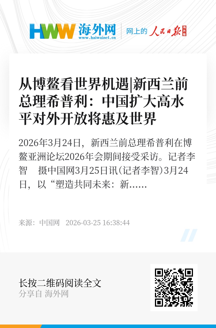 中国网3月25日讯(记者李智)3月24日,以“塑造共同未来:新形势、新机遇、新合作”为主题的博鳌亚洲论坛2026年年会在中国海南启幕。本届年会紧扣中国高质量发展、高水平对外开放等议题,搭建全球对话交流平台。新西兰前总理希普利(Jennifer Mary Shipley née Robson)在参会期间,就中国扩大高水平对外开放为亚太地区乃至世界带来的机遇分享了她的看法。