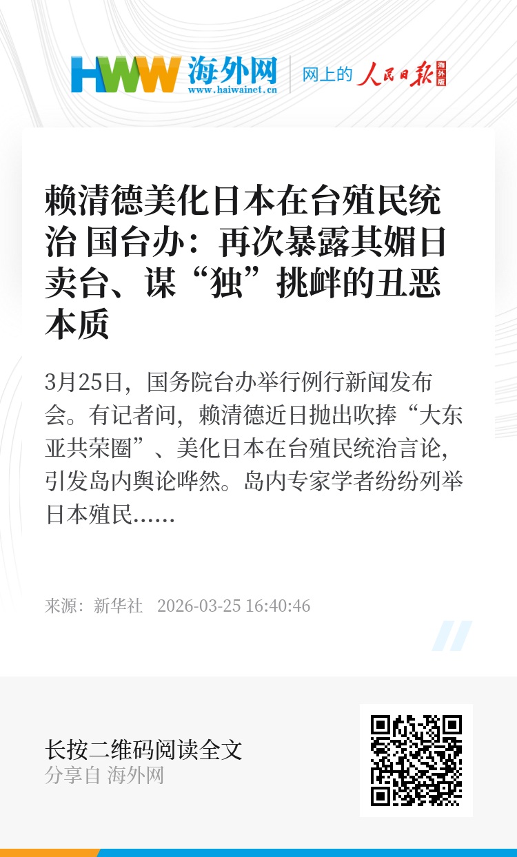 有记者问,赖清德近日抛出吹捧“大东亚共荣圈”、美化日本在台殖民统治言论,引发岛内舆论哗然。岛内专家学者纷纷列举日本殖民者在台犯下的屠杀、扫荡等罪行,批评赖清德当局为政党和个人私利,扭曲历史,媚日恋殖,制造仇恨与对立。对此有何评论?