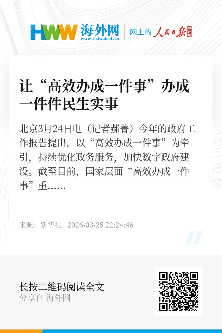 新华社北京3月24日电(记者郝菁)今年的政府工作报告提出,以“高效办成一件事”为牵引,持续优化政务服务,加快数字政府建设。截至目前,国家层面“高效办成一件事”重点事项清单已推出五批共55项,从新生儿出生到教育入学,从个人创业到灵活就业参保,“高效办成一件事”正把政务服务的“改革清单”常态化转变为群众、企业在办事时可感可及的“便利清单”。