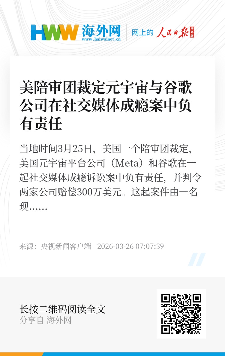随后Meta公司表示不同意这一裁决,其律师团队“正在评估法律选项”。谷歌暂未立即置评。(央视记者 朱磊 刘旭)