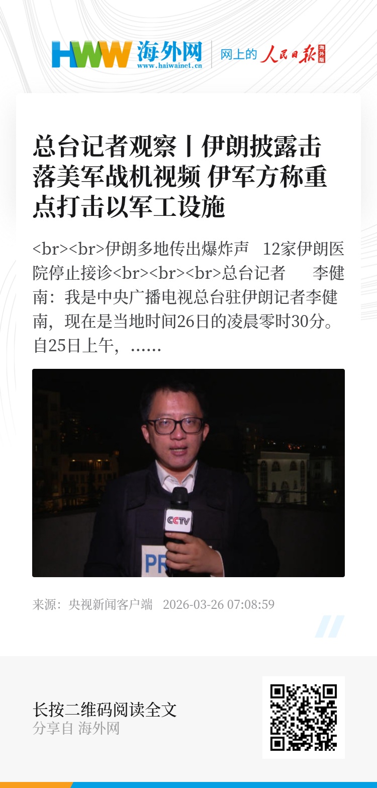 总台记者 李健南:此外,针对美国可能对伊朗出动地面部队,伊朗议会议长卡利巴夫25日晚发出警告称,伊朗情报显示“敌对势力”正计划在“某地区国家”支持下,准备占领伊朗的一座岛屿,伊朗已对其所有动向实施全方位监控,若对方胆敢实施行动,伊朗将对这个协助敌对势力的地区某国的所有关键基础设施发动“不受限制的”打击。