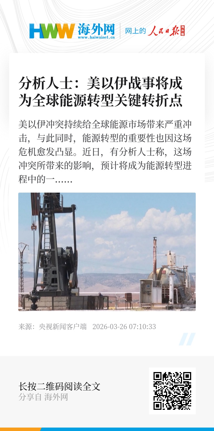 分析认为,美以伊冲突所带来的影响可能会加速各国摆脱化石燃料的步伐,并促使它们重新思考可再生能源在增强能源安全方面所能发挥的作用;在美以伊冲突爆发之前,能源转型就已经“进展得非常强劲”,但冲突引发的能源危机意味着,各国可能会在清洁能源上投资更多。