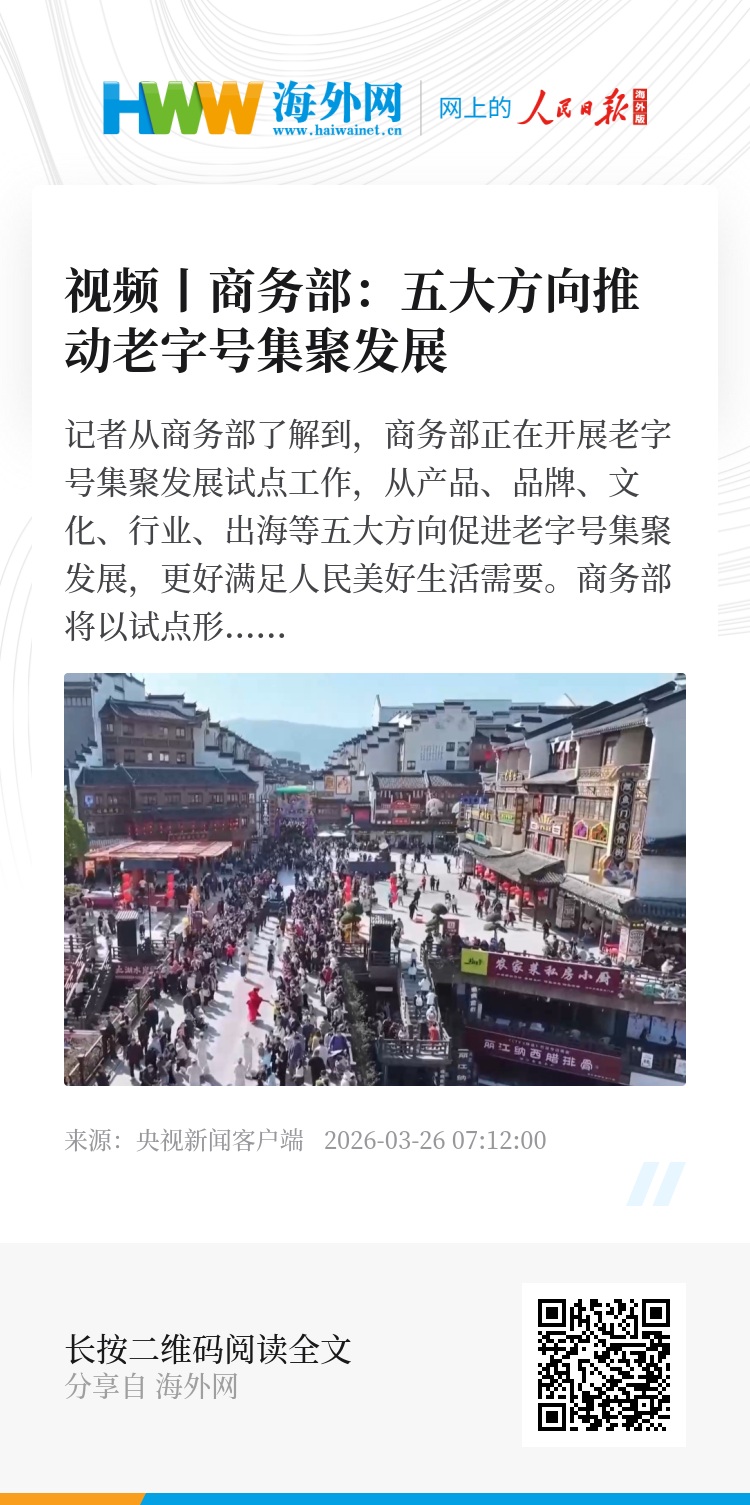 记者从商务部了解到,商务部正在开展老字号集聚发展试点工作,从产品、品牌、文化、行业、出海等五大方向促进老字号集聚发展,更好满足人民美好生活需要。