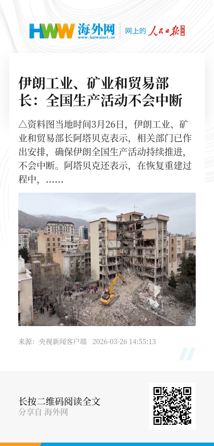 当地时间3月26日,伊朗工业、矿业和贸易部长阿塔贝克表示,相关部门已作出安排,确保伊朗全国生产活动持续推进,不会中断。