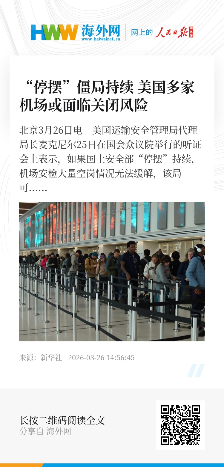 新华社北京3月26日电 美国运输安全管理局代理局长麦克尼尔25日在国会众议院举行的听证会上表示,如果国土安全部“停摆”持续,机场安检大量空岗情况无法缓解,该局可能不得不考虑关闭美国部分机场,直至资金恢复。