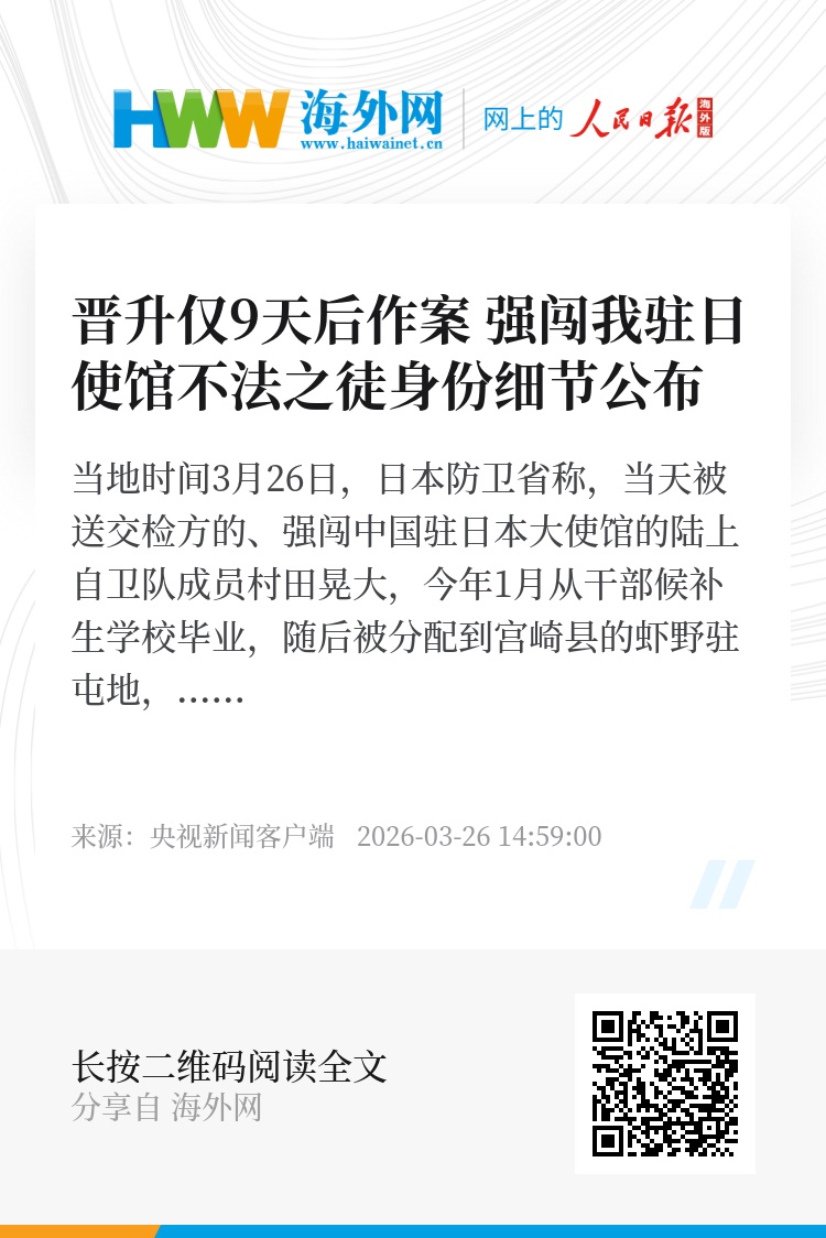 当地时间3月26日,日本防卫省称,当天被送交检方的、强闯中国驻日本大使馆的陆上自卫队成员村田晃大,今年1月从干部候补生学校毕业,随后被分配到宫崎县的虾野驻屯地,并于3月15日被晋升为三等陆尉。