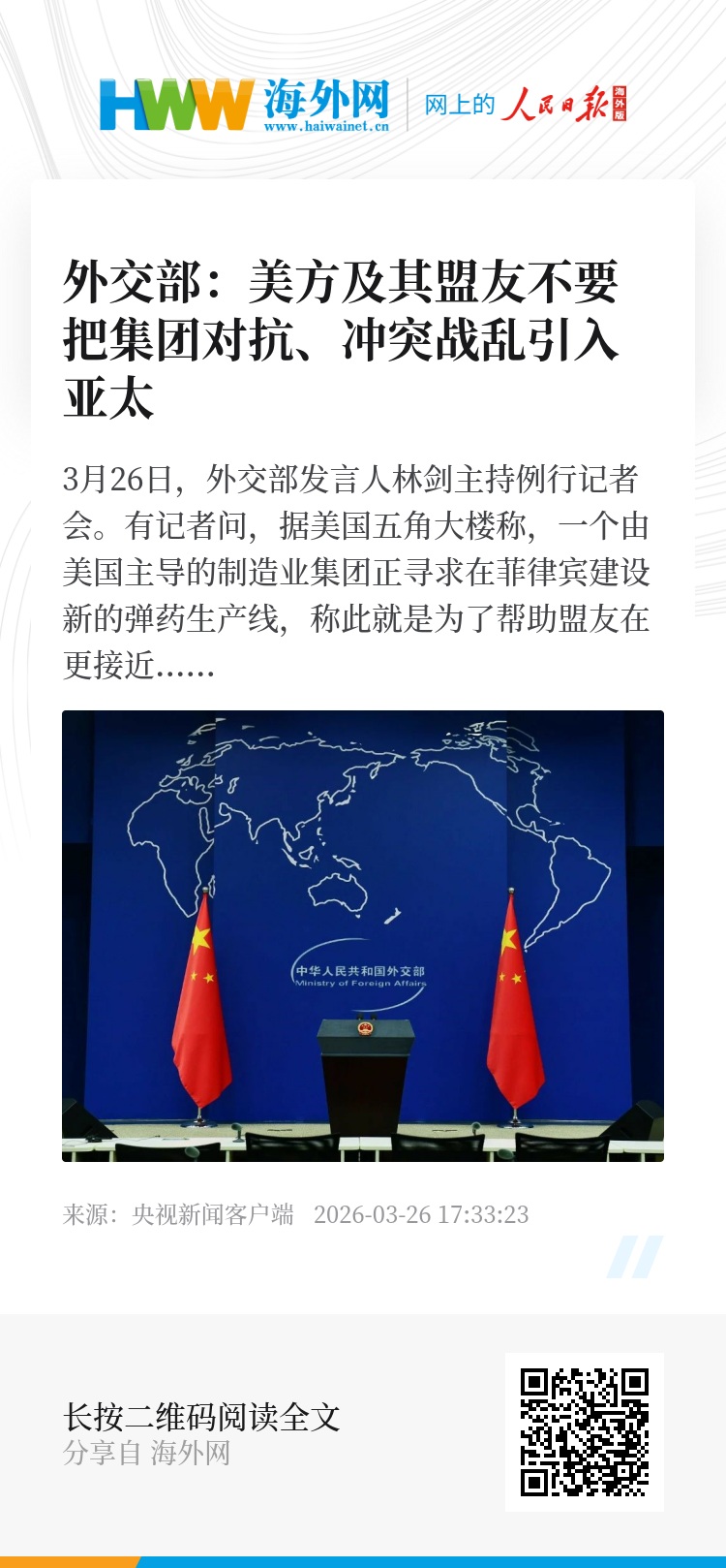 3月26日,外交部发言人林剑主持例行记者会。有记者问,据美国五角大楼称,一个由美国主导的制造业集团正寻求在菲律宾建设新的弹药生产线,称此就是为了帮助盟友在更接近潜在需求地区生产和维护军事装备,请问中方对此有何评论?
