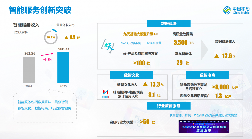 智能服务是赢得未来竞争的制高点,中国移动深化落实“人工智能+”行动,在数智生活、数智生产、数智治理场景发挥创新牵引作用。升级九天基础大模型3.0,推出超100款AI+产品及应用解决方案、29款垂类智能体,自主打造高质量数据集3500TB,数据算法收入同比增长12.6%,数智文化收入同比增长13.3%。重点布局超50款自研行业大模型,联合能源、水利、农业等行业龙头共建行业大模型,赋能新型工业化走深走实。2025年智能服务收入良好增长,完成人民币908亿元,同比增长5.3%。