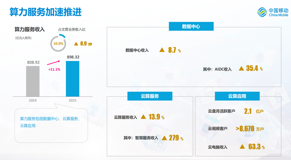 其中,算力服务是高质量发展的重要增长极,中国移动强化AIDC资源供给和储备,“AIDC+网络+算力+运维”服务能力明显提升,移动云品牌更加彰显。数据中心收入同比增长8.7%,其中AIDC收入同比增长35.4%。得益于智算需求的迅猛增长,智算服务成为第一引擎、增速达279%,拉动云算服务收入同比增长13.9%。云盘月活跃客户达到2.1亿户,云视频客户超8,670万户。2025年算力服务收入快速增长,完成人民币898亿元,同比增长11.1%。
