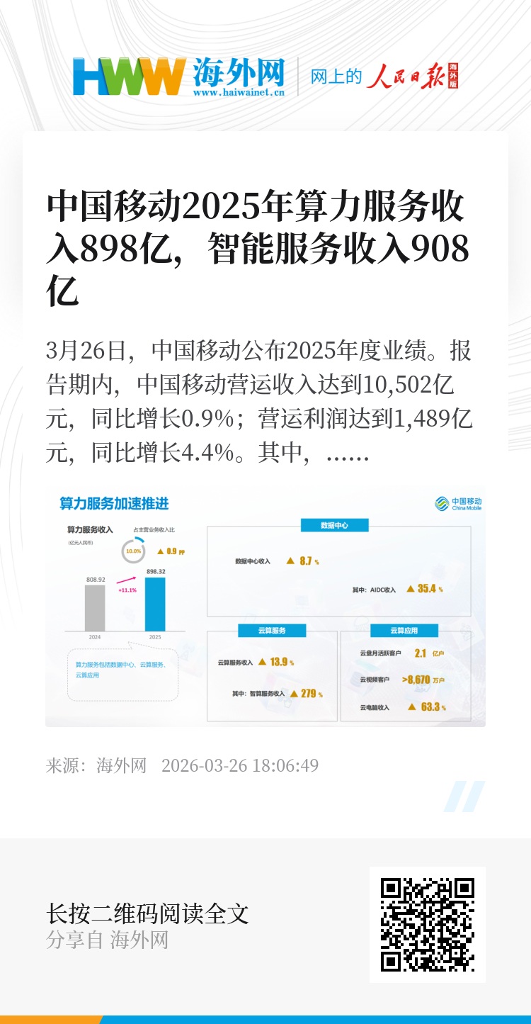 3月26日,中国移动公布2025年度业绩。报告期内,中国移动营运收入达到10,502亿元,同比增长0.9%;营运利润达到1,489亿元,同比增长4.4%。