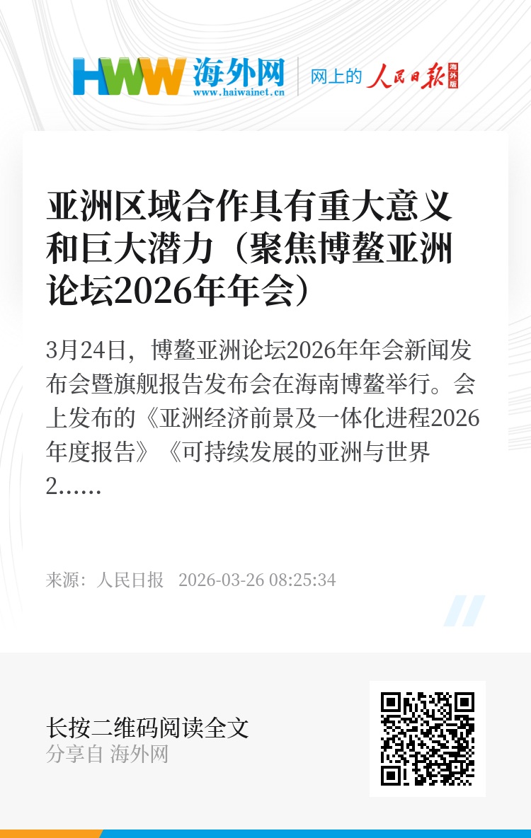 3月24日,博鳌亚洲论坛2026年年会新闻发布会暨旗舰报告发布会在海南博鳌举行。会上发布的《亚洲经济前景及一体化进程2026年度报告》《可持续发展的亚洲与世界2026年度报告》显示,亚洲经济呈现强劲韧性和向好趋势,为世界经济和可持续发展作出重要贡献。与会嘉宾认为,亚洲区域合作具有重大意义和巨大潜力,各方应坚定合作信心、携手应对挑战,为动荡的世界注入更多确定性和正能量。