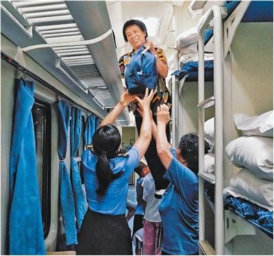硬卧车厢内,列车工作人员正合力帮助一名老年旅客将行李放置到行李架上。