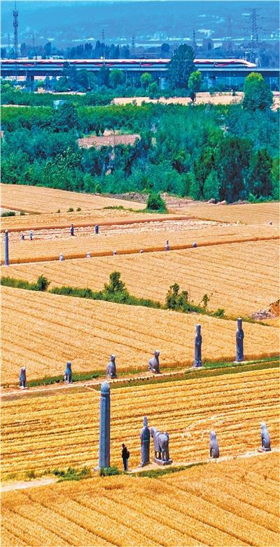 河南巩义,一列复兴号动车组列车在金色田野上飞驰。