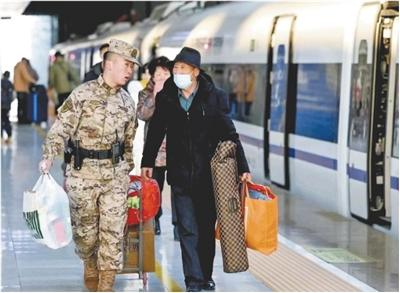 甘肃兰州,兰州西站,武警甘肃总队兰州支队执勤官兵帮助老人提行李。