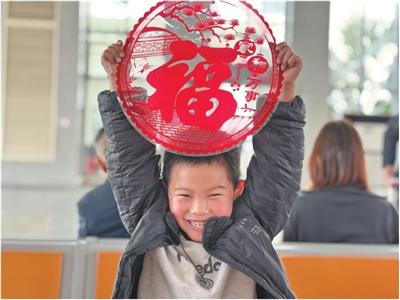 江西南昌,南昌西站的候车室内,一名小男孩用小小的手掌,高高举起一张“福”字。