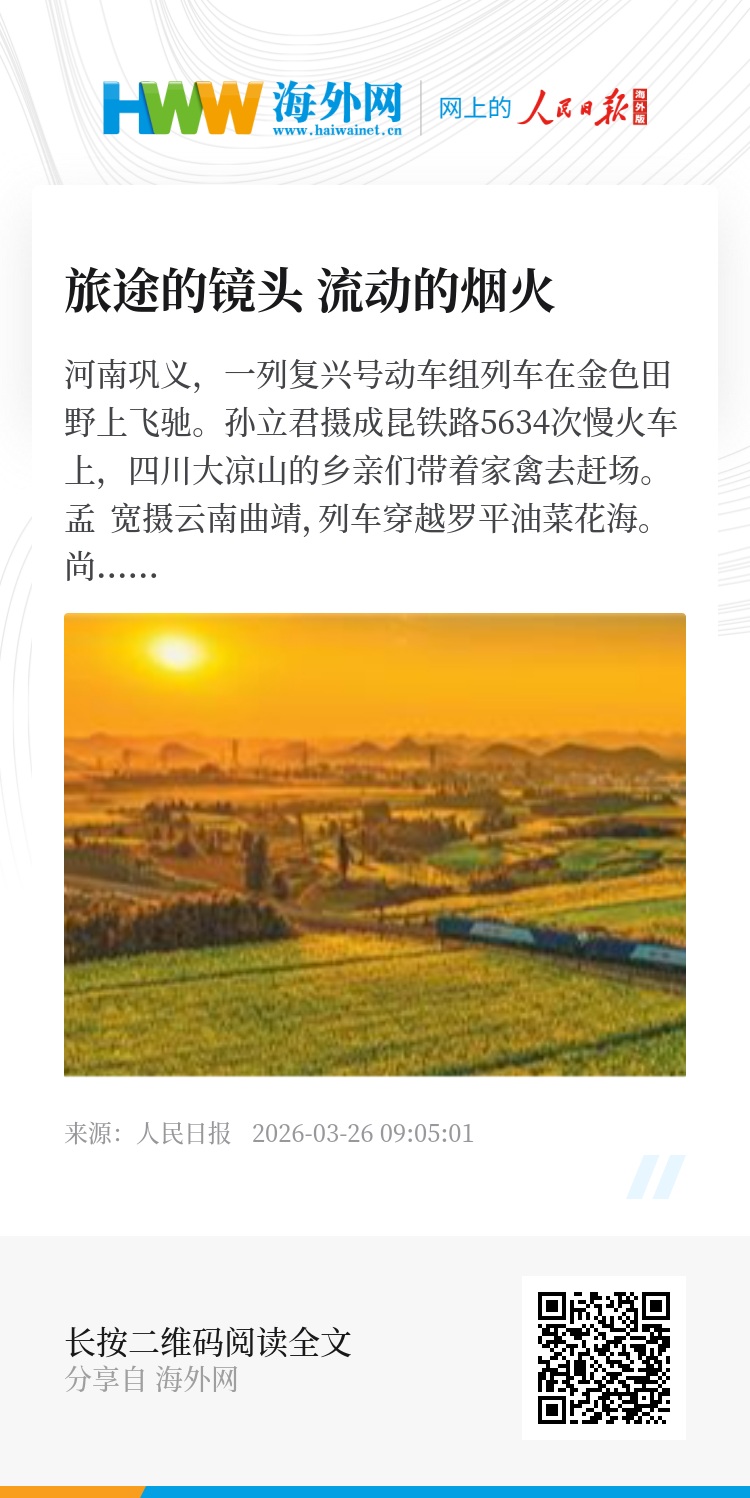 由中宣部文明创建局、中央网信办网络传播局、广电总局宣传司、文化和旅游部资源开发司、中国文联国内联络部、中国作协创作联络部、国家铁路集团党组宣传部联合举办的2026年“我的铁路风景”主题宣传活动于1月启动,这是该活动连续第二年举办。本报从活动征集的83万余件作品中挑选精彩的光影瞬间,透过网友们的镜头,注视一张张生动的面孔、欣赏一幕幕流动如诗的景致。车窗内外,一幅气象万千的美丽画卷在山河大地间铺展开来。