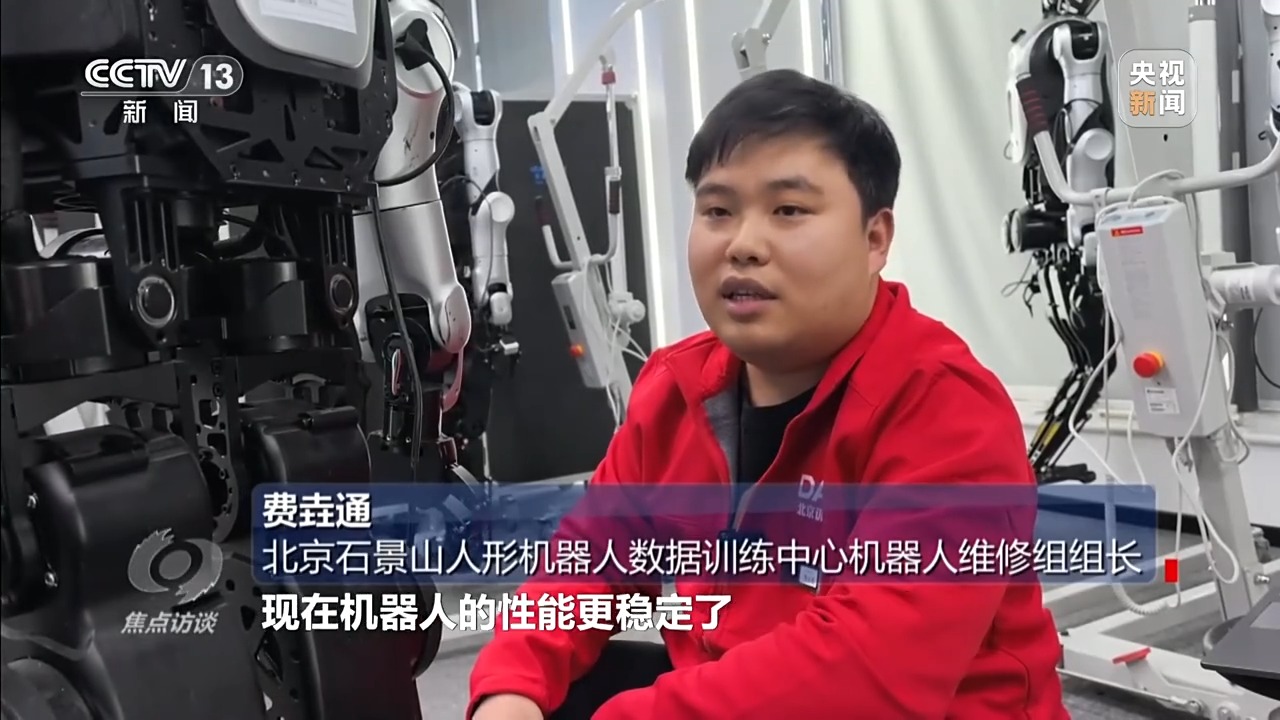 北京石景山人形机器人数据训练中心机器人维修组组长 费垚通:半年前,机器人需要维修的频率比现在高,现在机器人的性能更稳定了。但是,真正走入实际工作场景,还需要很多训练任务。不过看到它现在的进步效率,我坚信它能够在不久的未来,在更艰苦、更危险的环境替我们分担工作,我相信这一天一定会到来。