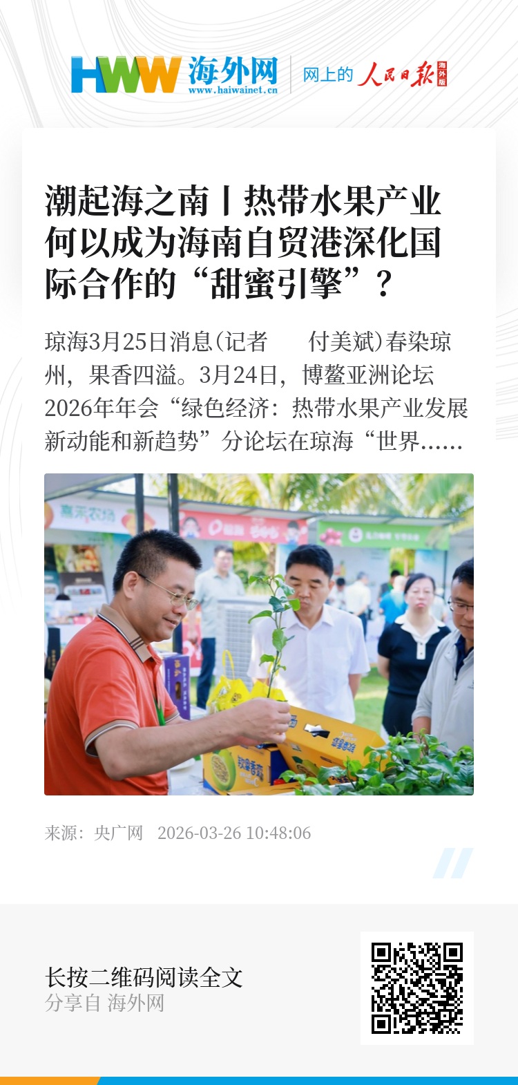 央广网琼海3月25日消息(记者 付美斌)春染琼州,果香四溢。3月24日,博鳌亚洲论坛2026年年会“绿色经济:热带水果产业发展新动能和新趋势”分论坛在琼海“世界热带水果之窗”举办。嘉宾齐聚,借博鳌国际平台,回顾产业发展成效,聚焦气候变化与消费升级,抢抓海南自贸港封关运作机遇,探寻高质量发展路径,解码海南热带水果成为国际合作“甜蜜引擎”的内在逻辑。
