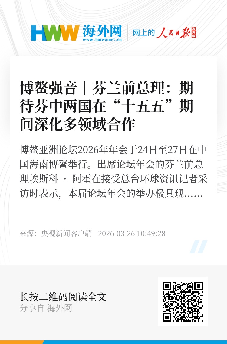 博鳌亚洲论坛2026年年会于24日至27日在中国海南博鳌举行。出席论坛年会的芬兰前总理埃斯科 · 阿霍在接受总台环球资讯记者采访时表示,本届论坛年会的举办极具现实意义。他还表示,期待芬中两国在“十五五”期间深化多领域合作。