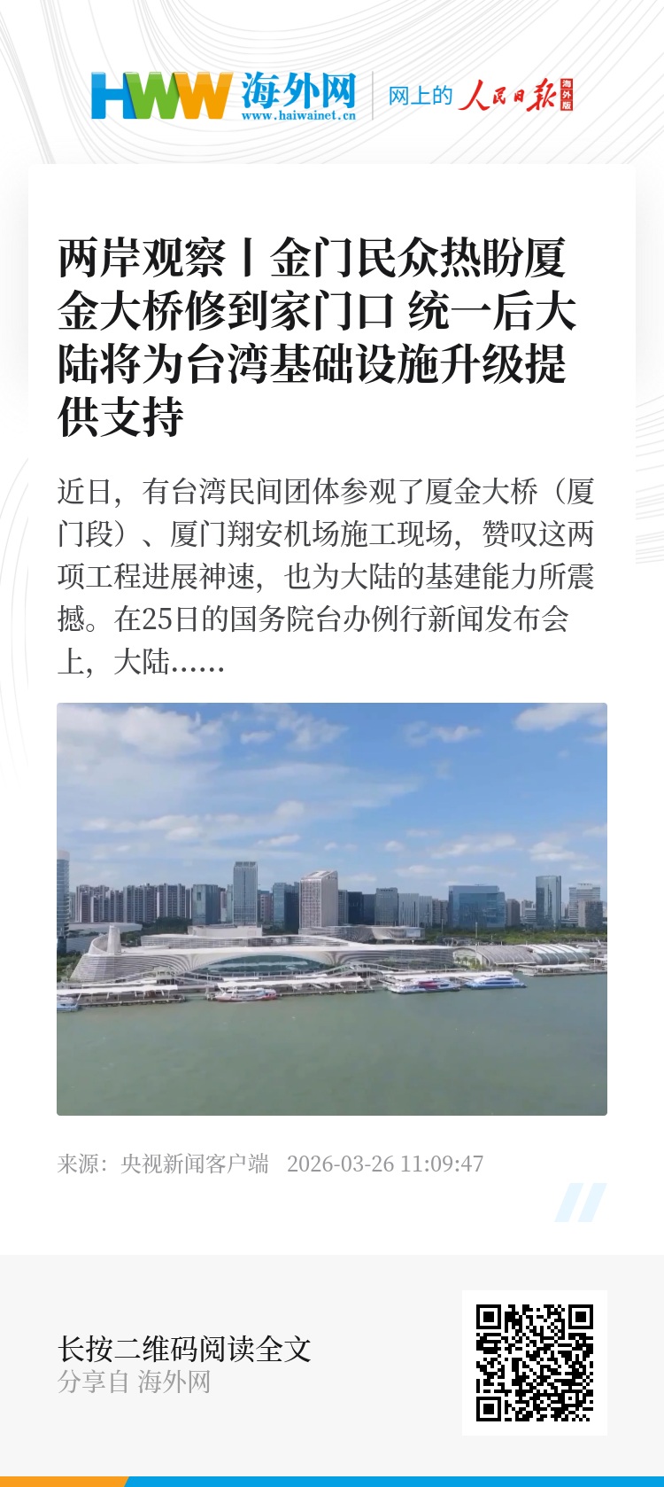 此前,金门县长陈福海更是直接用一句“金门的乡亲没有一个不会支持”表达当地民众对于厦金大桥早日建成的热盼。