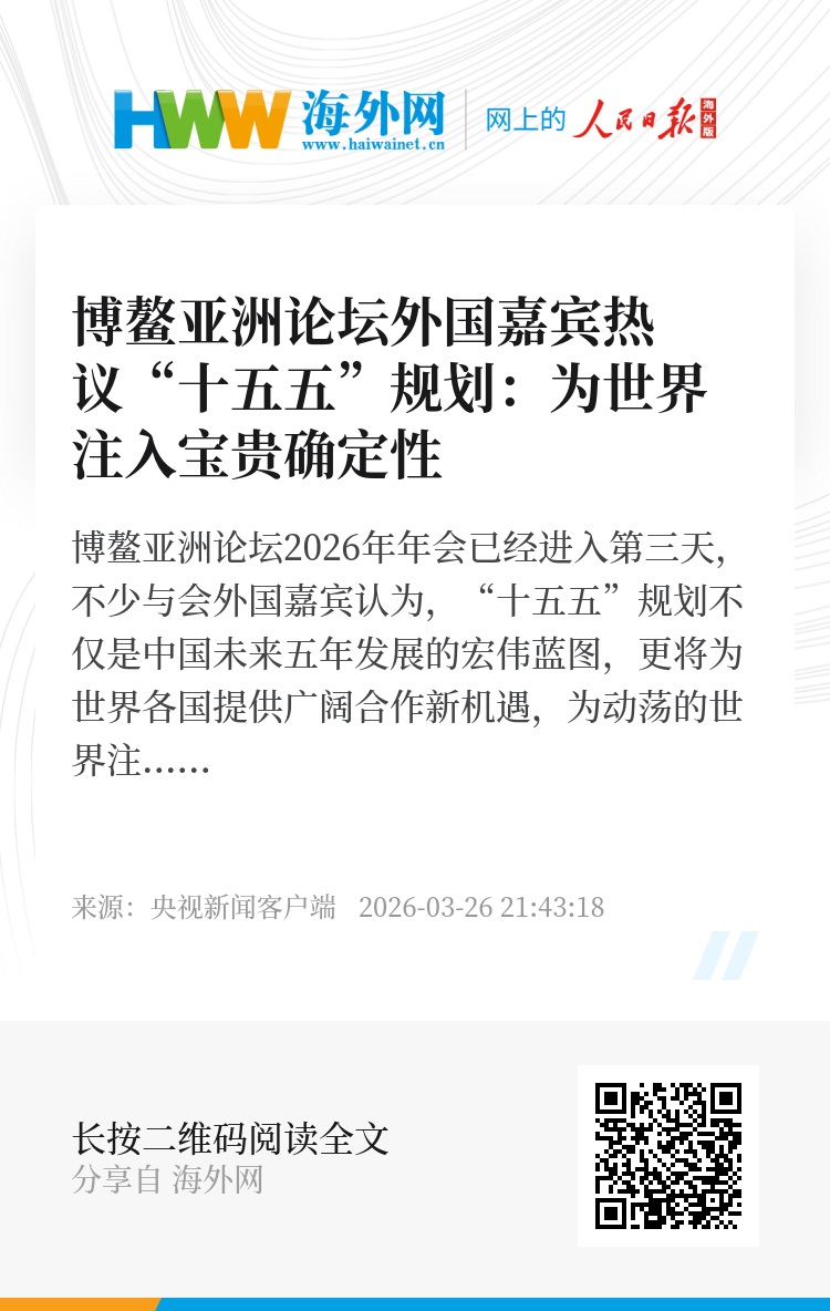 博鳌亚洲论坛2026年年会已经进入第三天,不少与会外国嘉宾认为,“十五五”规划不仅是中国未来五年发展的宏伟蓝图,更将为世界各国提供广阔合作新机遇,为动荡的世界注入宝贵的确定性。