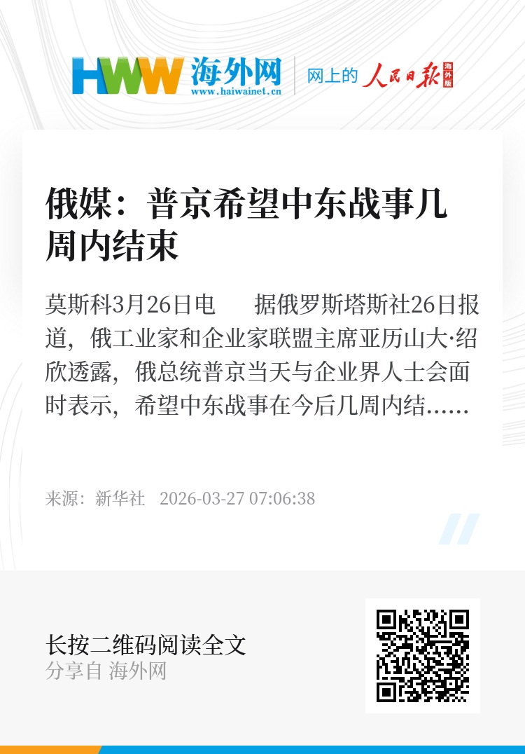 新华社莫斯科3月26日电 据俄罗斯塔斯社26日报道,俄工业家和企业家联盟主席亚历山大·绍欣透露,俄总统普京当天与企业界人士会面时表示,希望中东战事在今后几周内结束。