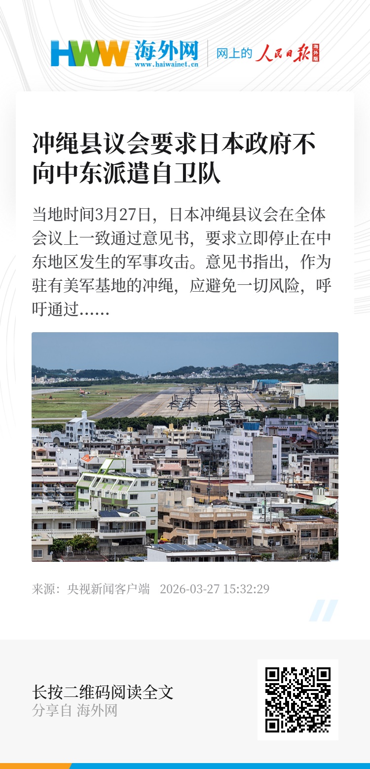 当地时间3月27日,日本冲绳县议会在全体会议上一致通过意见书,要求立即停止在中东地区发生的军事攻击。意见书指出,作为驻有美军基地的冲绳,应避免一切风险,呼吁通过和平方式解决问题。