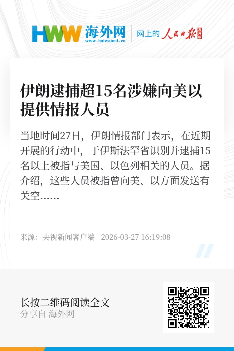 当地时间27日,伊朗情报部门表示,在近期开展的行动中,于伊斯法罕省识别并逮捕15名以上被指与美国、以色列相关的人员。