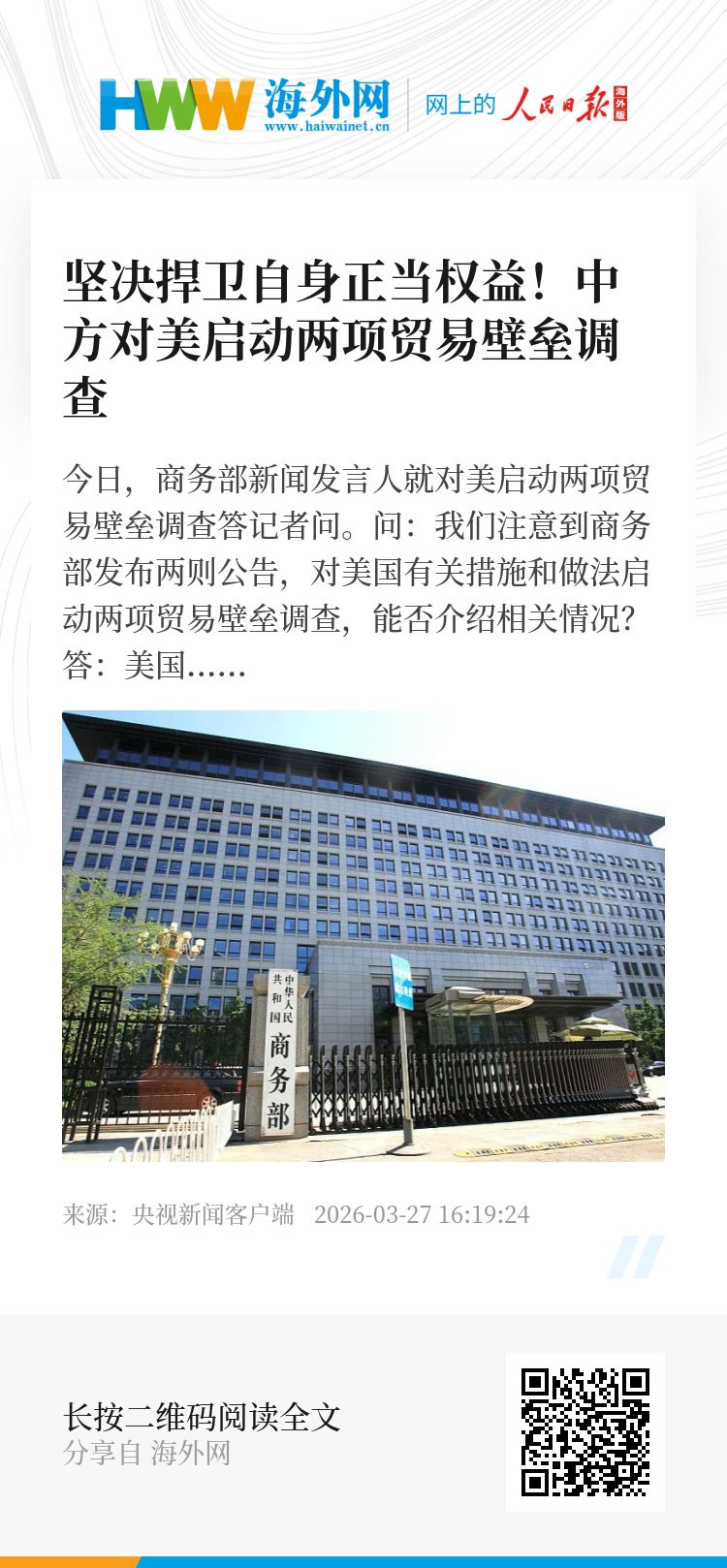 为坚决维护中国相关产业利益,依据《中华人民共和国对外贸易法》和《对外贸易壁垒调查规则》有关规定,针对美对华两起301调查,商务部于3月27日对外发布两则公告,分别就美国破坏全球产供链相关做法和措施、美国阻碍绿色产品贸易相关做法和措施,对等发起两项贸易壁垒调查。