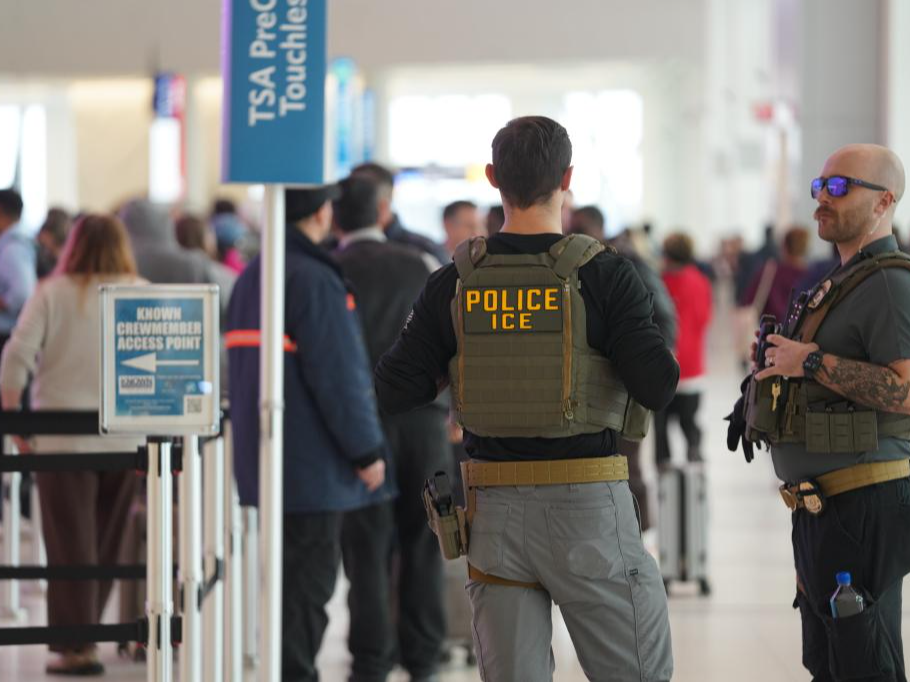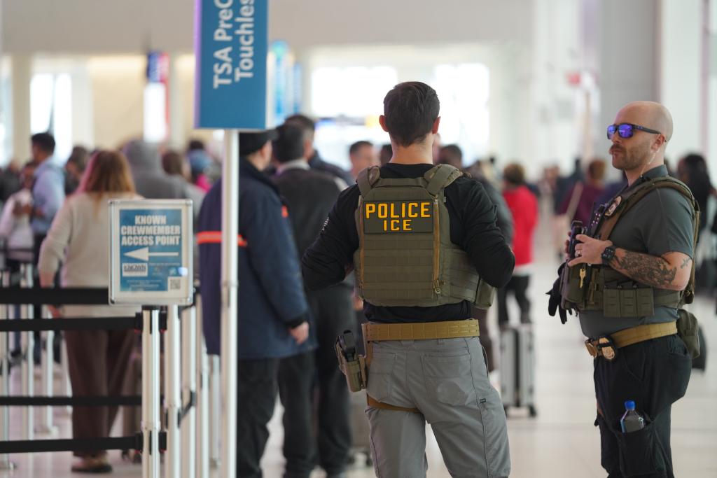 3月23日,移民与海关执法局的执法人员在美国纽约拉瓜迪亚机场的出发安检处执勤。新华社记者张凤国摄