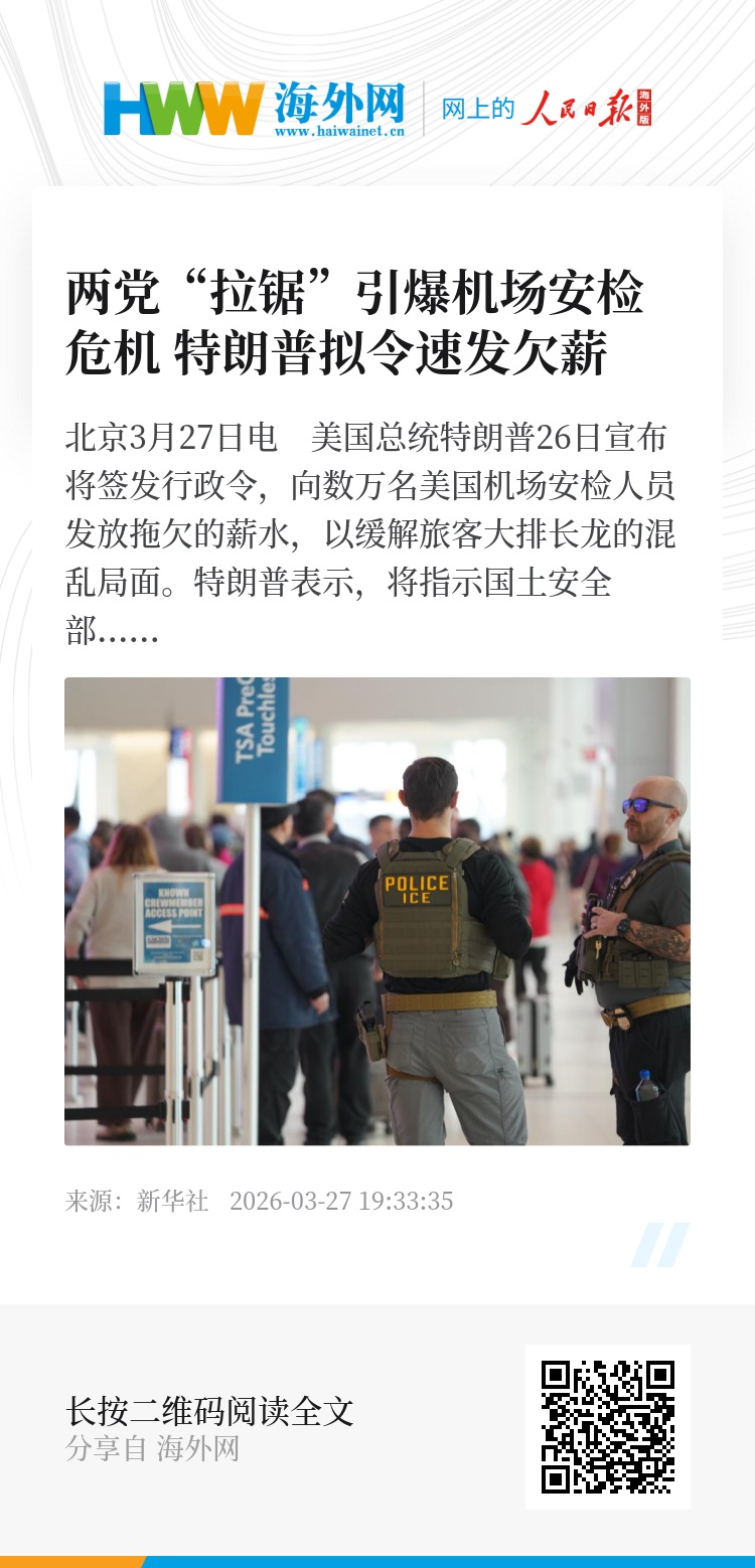 新华社北京3月27日电 美国总统特朗普26日宣布将签发行政令,向数万名美国机场安检人员发放拖欠的薪水,以缓解旅客大排长龙的混乱局面。