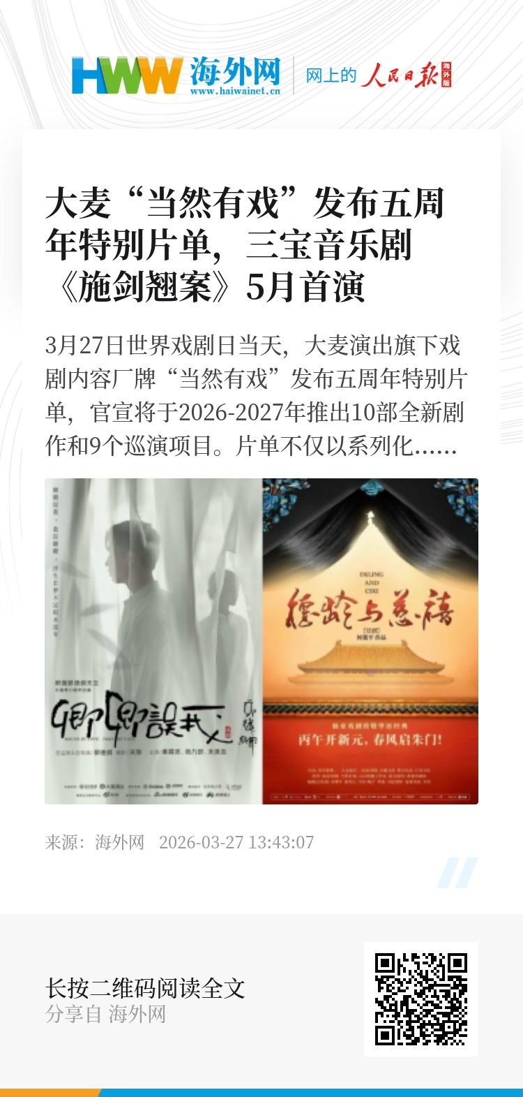 3月27日世界戏剧日当天,大麦演出旗下戏剧内容厂牌“当然有戏”发布五周年特别片单,官宣将于2026-2027年推出10部全新剧作和9个巡演项目。片单不仅以系列化的布局、丰富的项目储备,展现出“当然有戏”蓬勃的内容创制力,也通过深度的国际合作与全周期的IP运营,彰显出平台型戏剧厂牌的商业运作力。