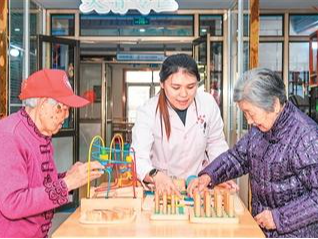 3月25日,在山东省胶州市一家养护院,护理人员在协助老人进行益智训练。王昭脉摄(新华社发)