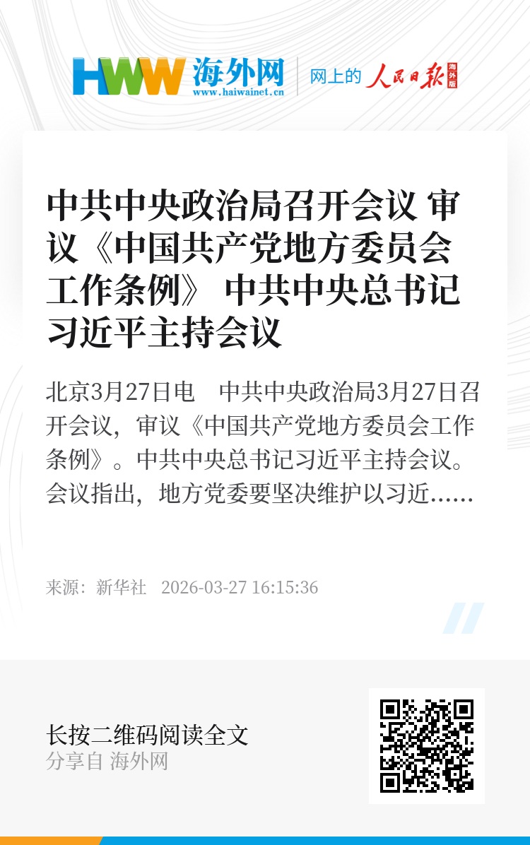 新华社北京3月27日电 中共中央政治局3月27日召开会议,审议《中国共产党地方委员会工作条例》。中共中央总书记习近平主持会议。