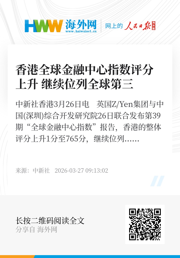 中新社香港3月26日电 英国Z/Yen集团与中国(深圳)综合开发研究院26日联合发布第39期“全球金融中心指数”报告,香港的整体评分上升1分至765分,继续位列全球第三、亚太区第一,与位列第一的纽约和第二的伦敦的分数差距分别仅为2分和1分。