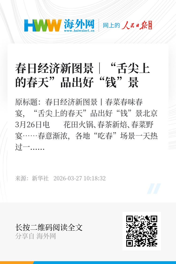 新华社北京3月26日电 花田火锅、春茶新焙、春菜野宴……春意渐浓,各地“吃春”场景一天热过一天,舌尖上的时令美味,正在撬动餐饮、文旅、生鲜等多领域的消费热潮。